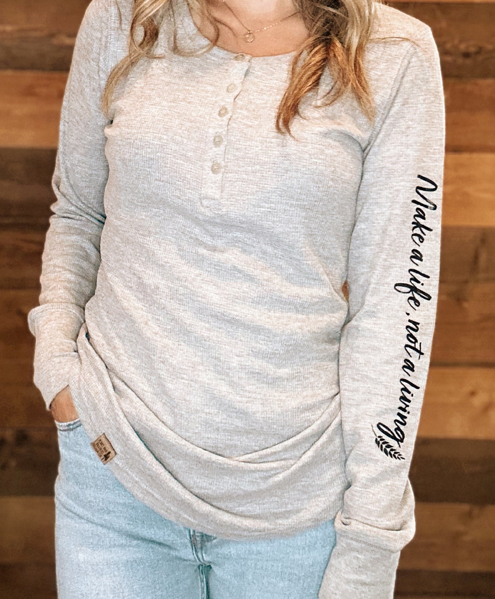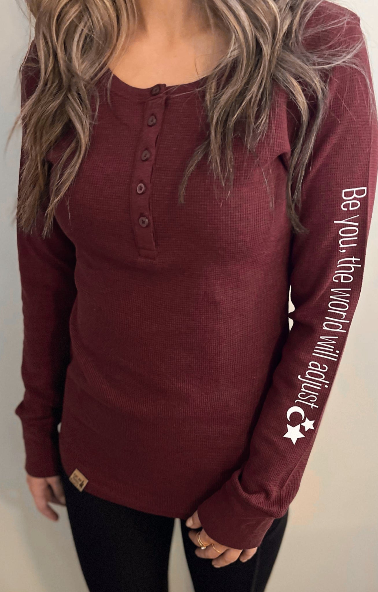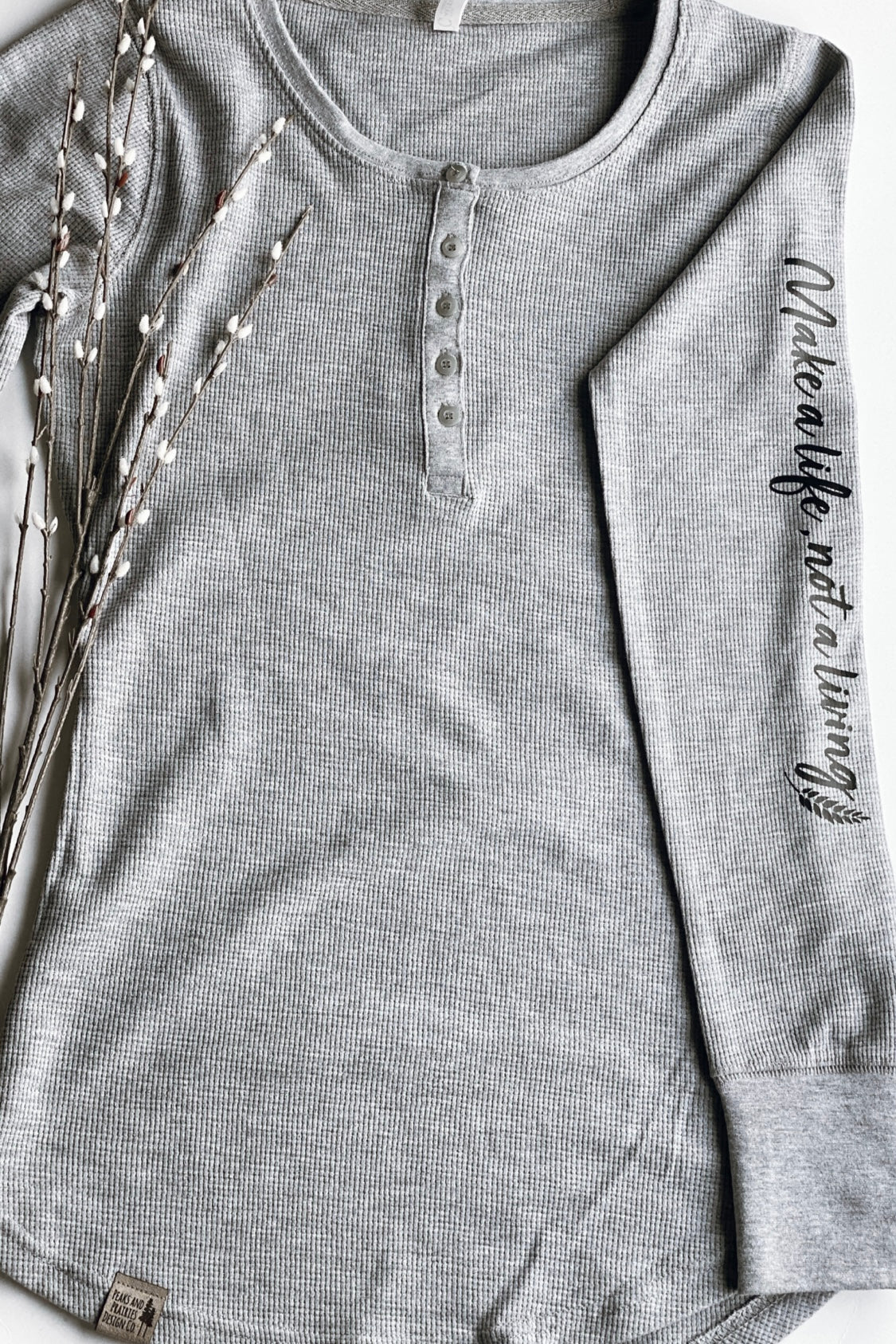 Vintage Waffle Henley with vinyl logo and leather patch.